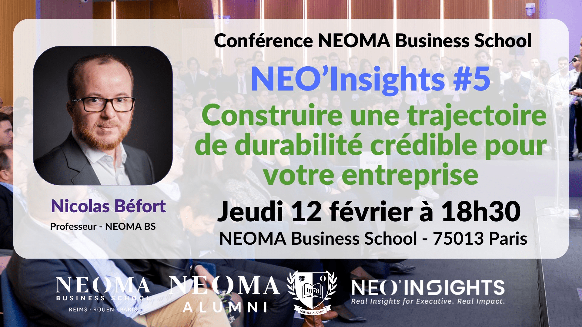 Lors de cette 5ᵉ conférence NEO’Insights, Nicolas Béfort, Professeur à NEOMA Business School et spécialiste de l’économie de la durabilité, partagera une feuille de route concrète et actionnable pour aider les entreprises à construire une trajectoire de durabilité adaptée à leur réalité. Thomas Cornelis, expert du monde industriel, apportera le regard du programme TRANSITIONS, en montrant comment les données et les indicateurs d’impact permettent de traduire les trajectoires de durabilité présentées par Nicolas Béfort en actions concrètes sur le terrain.