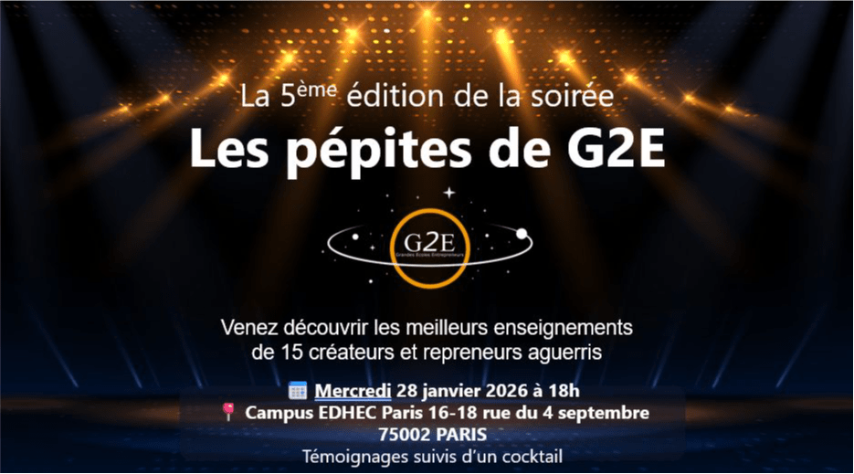 L’association Grandes Ecoles Entrepreneurs (G2E) qui réunit les Clubs Entreprendre et Repreneurs de 28 Grandes Ecoles, vous invite à venir rencontrer 8 Créateurs et 7 Repreneurs parmi les Alumnis de ces Grandes Ecoles, qui vous feront part de la concrétisation de leur projet et des enseignements qu’ils en ont tirés.