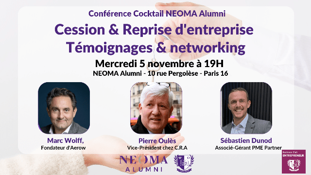 ⇨ Pierre Oulès (CRA) et Sébastien Dunod (PME Partner), Alumni PGE 2005, se joindront à lui pour partager leurs expériences et répondre aux questions de l'auditoire à propos de cessions et d'acquisitions d'entreprise.